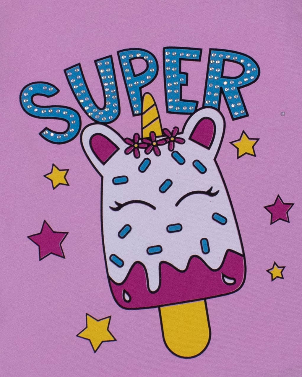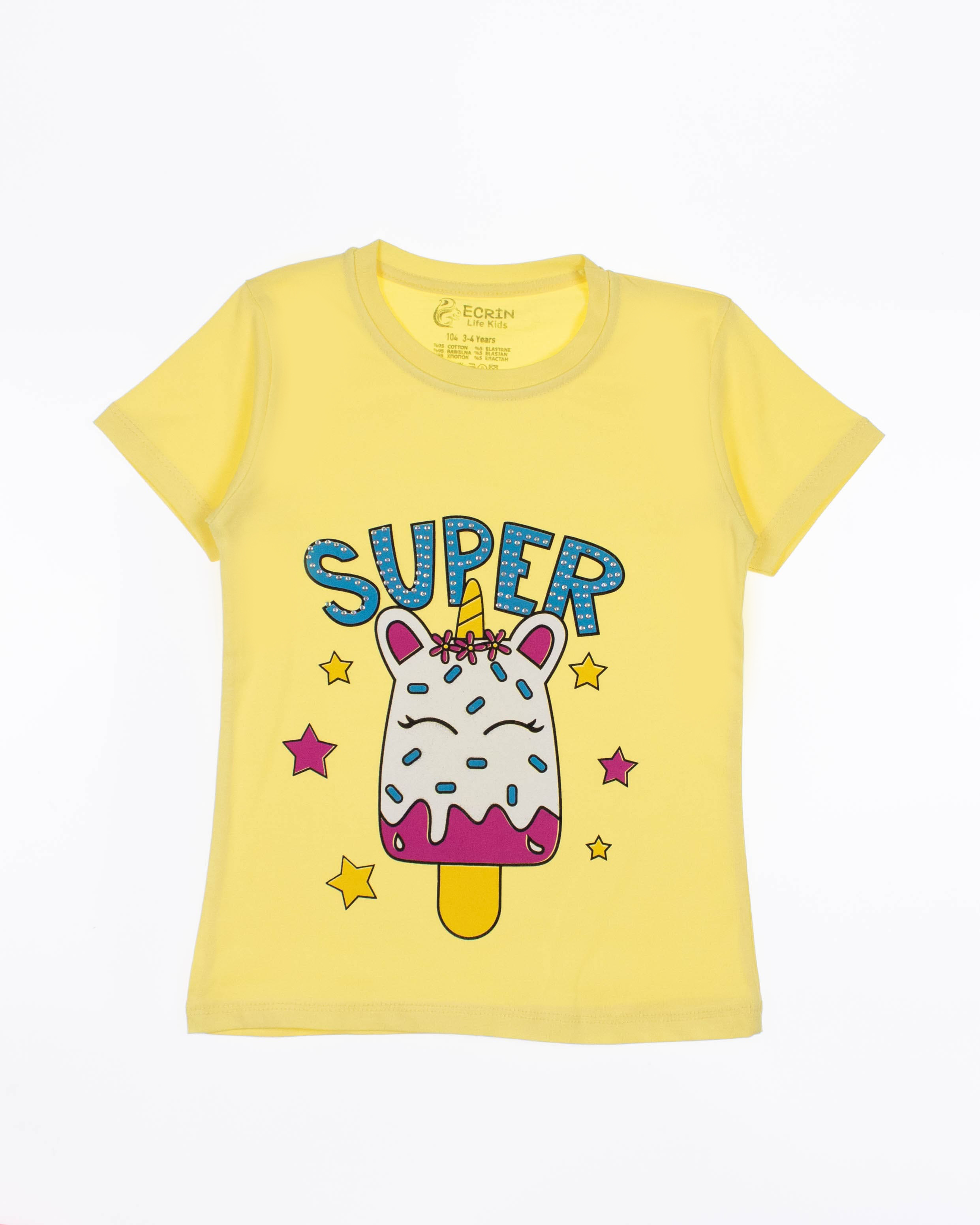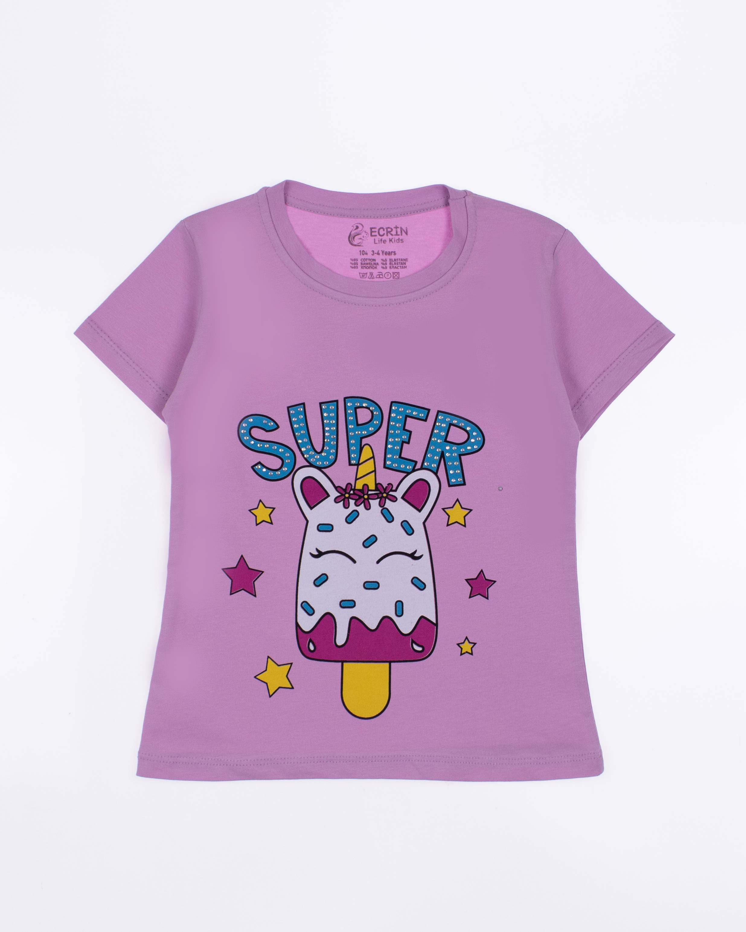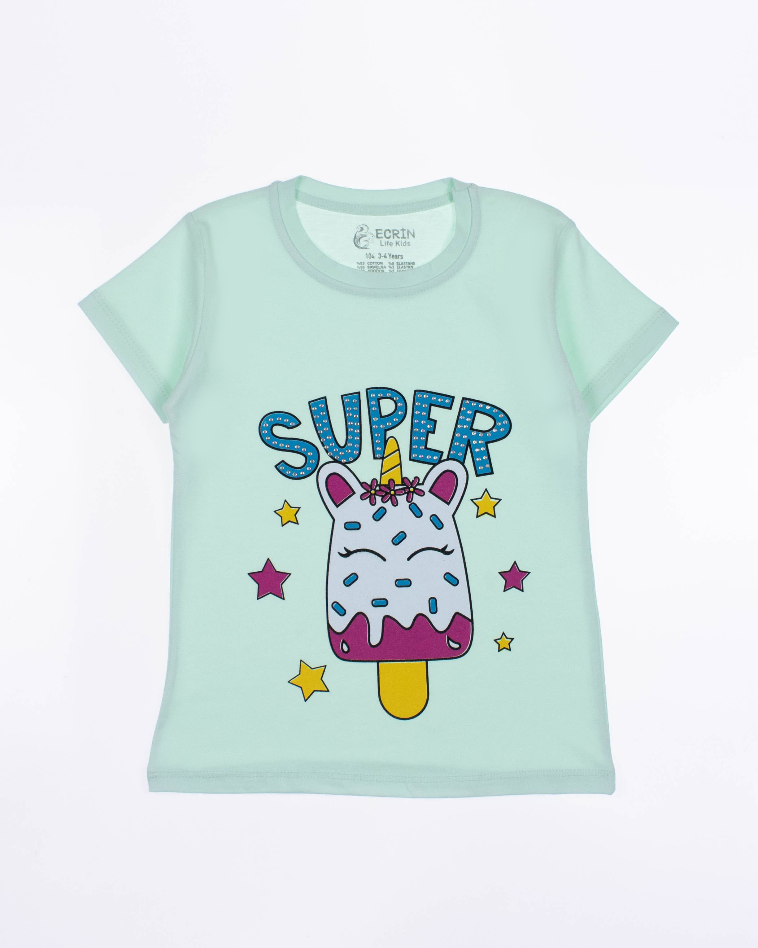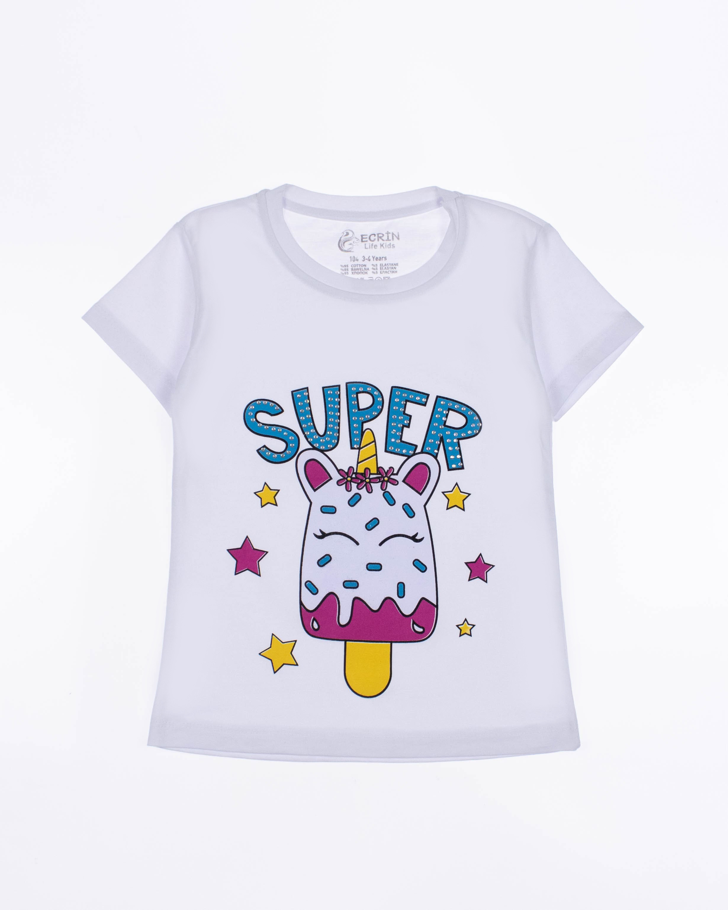 Футболка ECRIN для девочки оптом, производства Турция. Модель приталенного силуэта с короткими рукавами и милым принтом. Принт украшен стразами.
