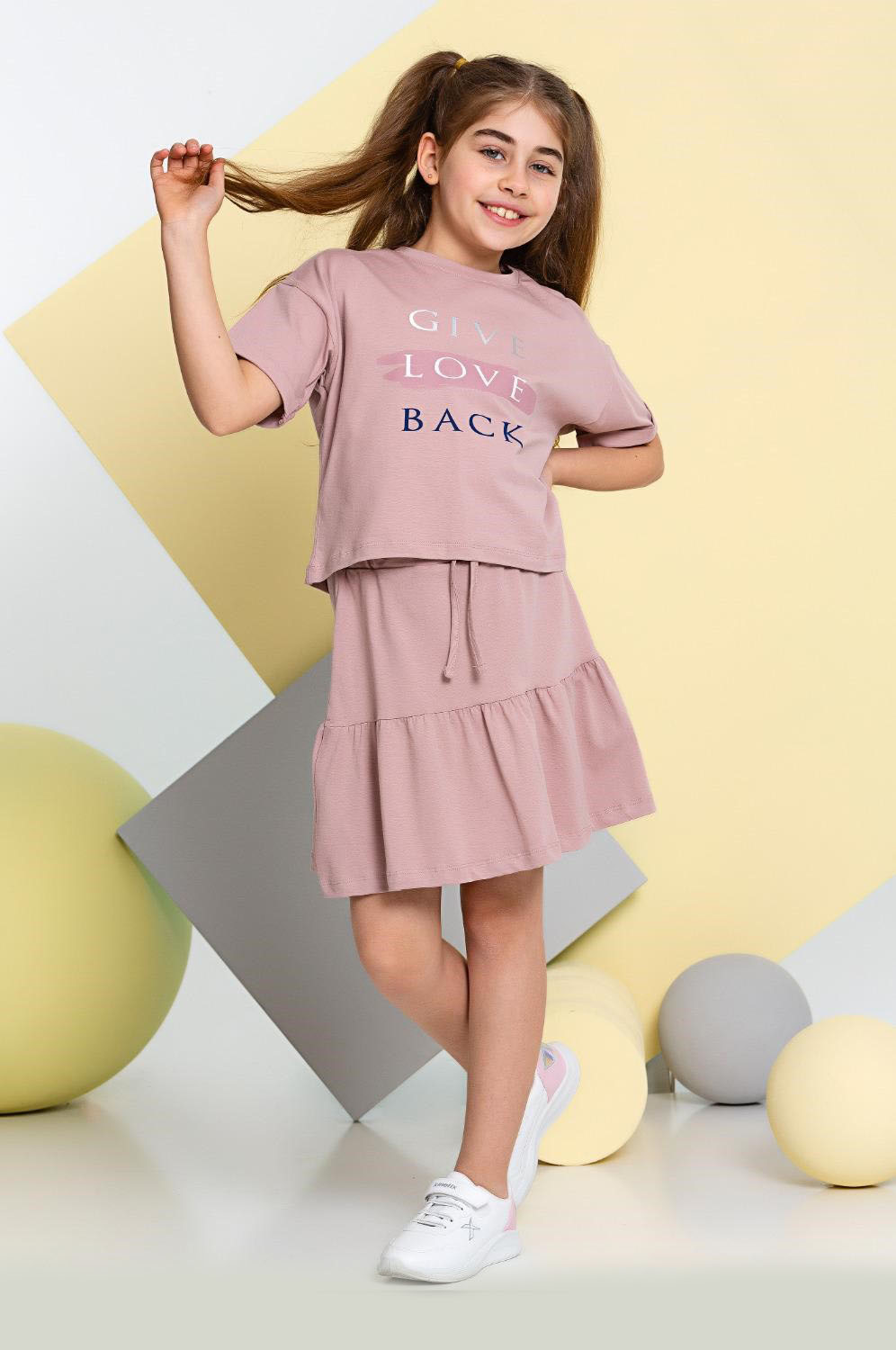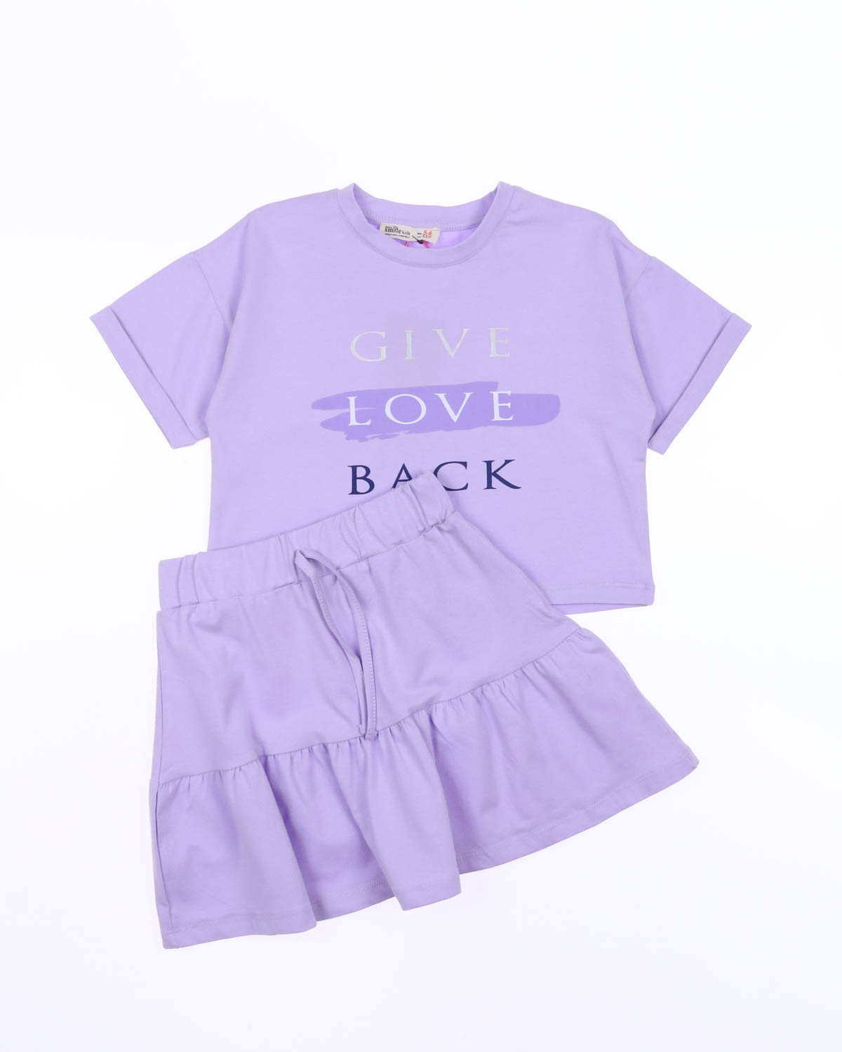 Летний костюм для девочки Smile оптом. Костюм для девочек из хлопка с добавлением эластана. В наборе юбка свободного летящего кроя и футболка с короткими рукавами. Футболка укороченная, прямого кроя, на груди надпись. Хлопковый костюм идеален в летнюю жару. Натуральная ткань позволяет дышать нежной детской коже. Костюмчик на каждый день.