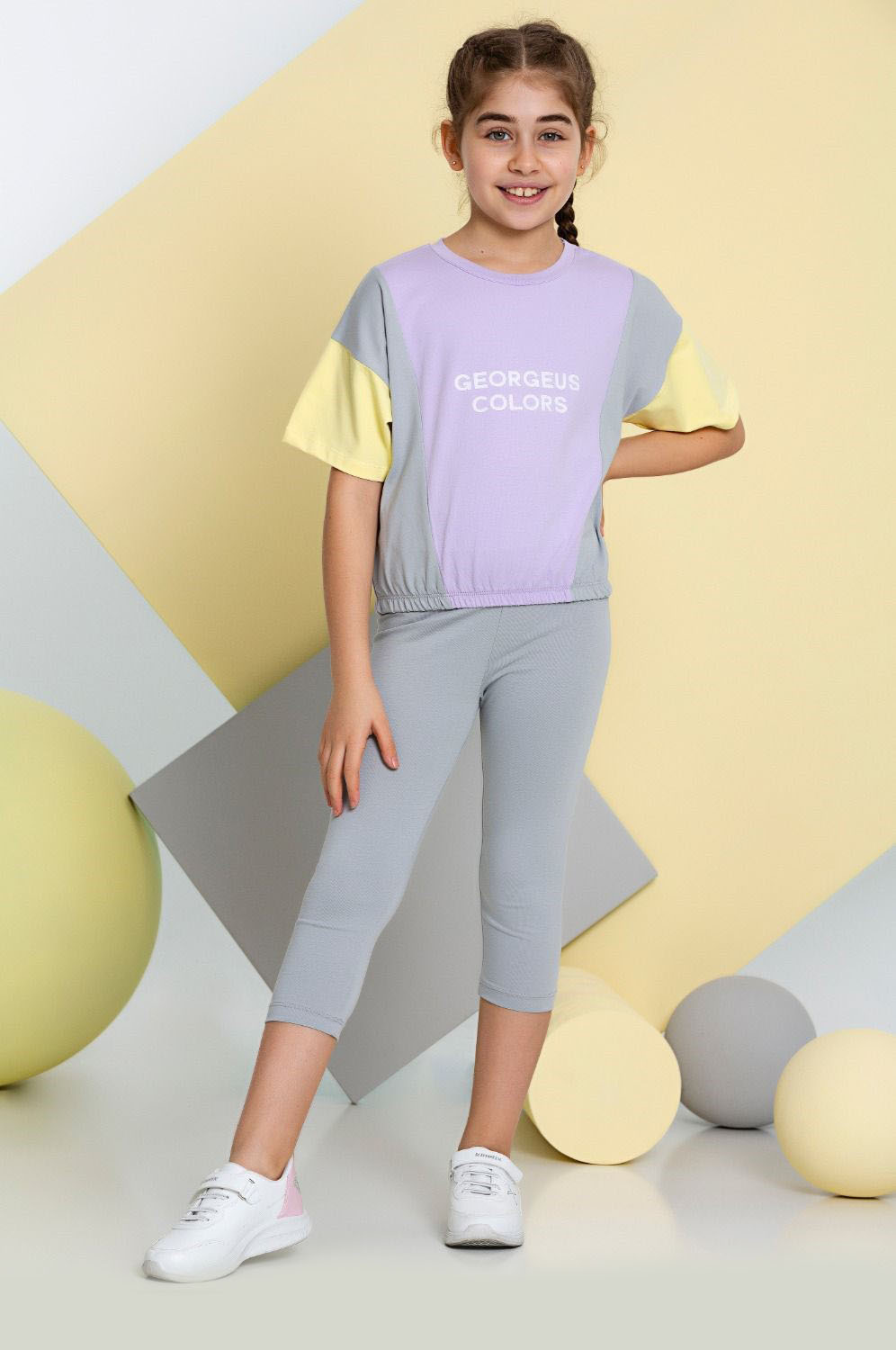 Костюм отлично сидит на фигурах разных типов. Укороченная футболка со спущенным рукавом на резинке и бриджи делают летний комплект оригинальным и стильным. Костюм выполнен из мягкого трикотажа кулирка.