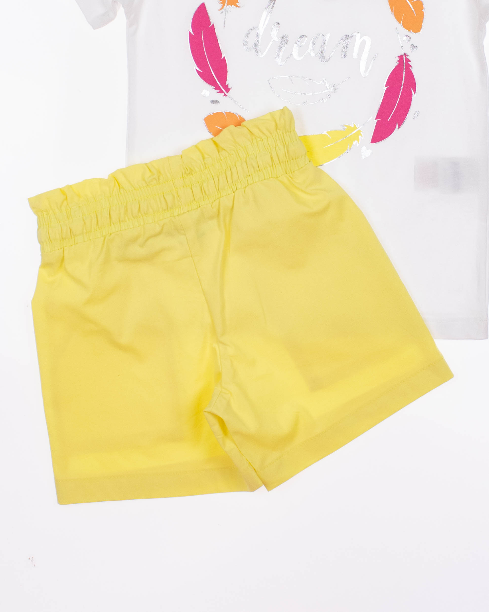 Костюм для девочки состоит из двух предметов. Футболка прямого кроя с округлой горловиной. Шорты прямые на резинке, выполнены из легкого хлопка, по бокам два вместительных кармана.