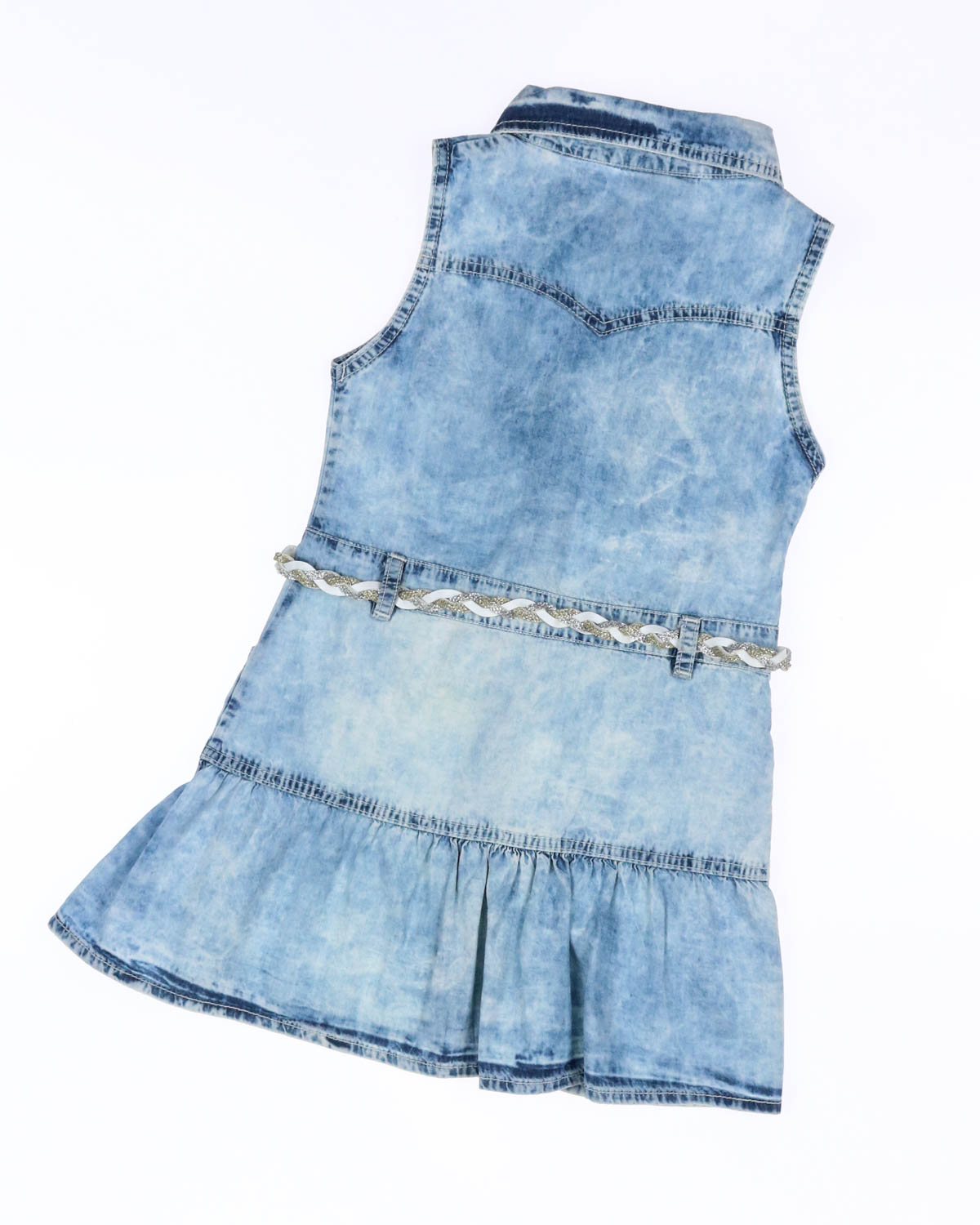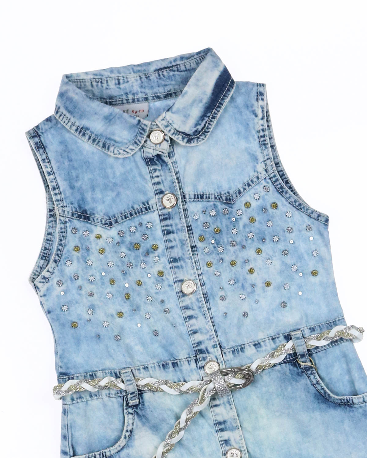 Летнее платье из легкой джинсы. Без рукавов с боковыми карманами. Застегивается на пуговицы. Платье декорировано вышивкой и пайетками.