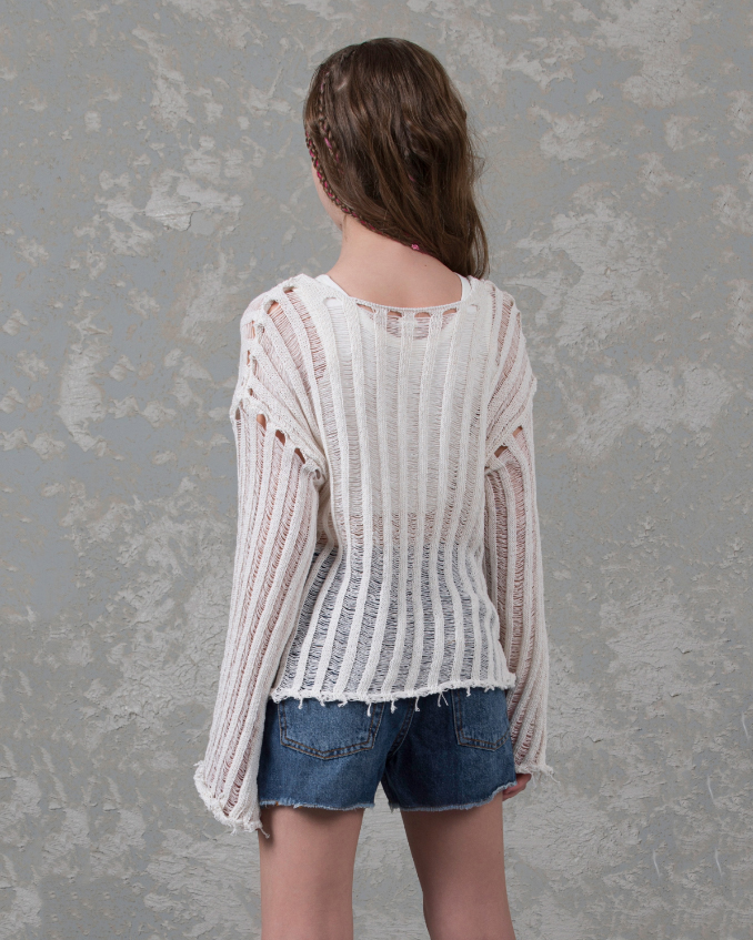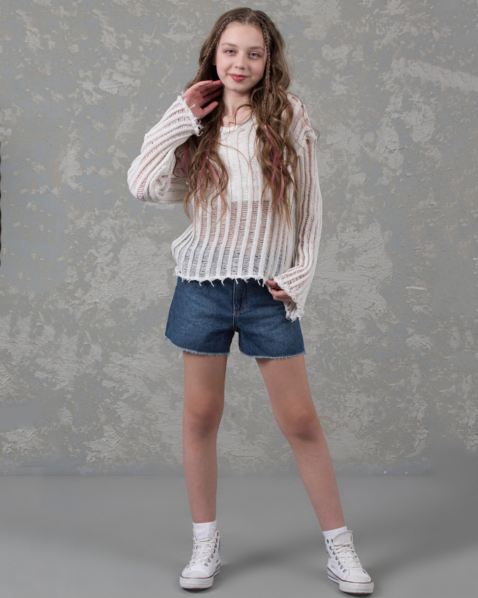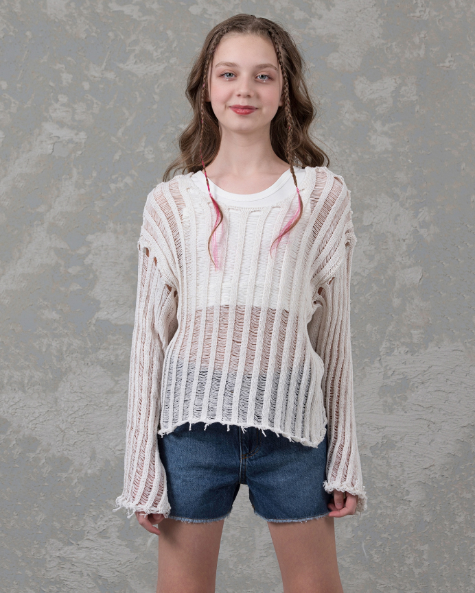 Джемпер DMB для девочек ажурной вязки оптом, выполнен  из  хлопка. Свободный крой, круглый вырез горловины.  Модель отлично сочетается с любой одеждой. Под низ можно надеть удлиненный или короткий топ в тон джемперу.