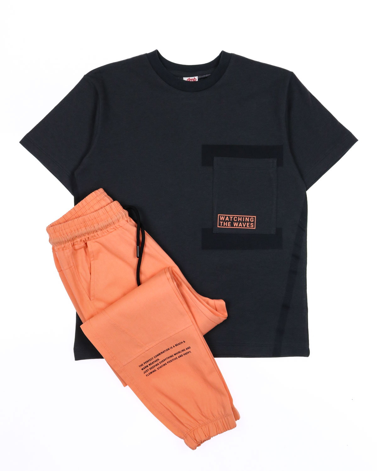 Летний костюм DMB оптом. Футболка прямого кроя с короткими рукавами, на груди пришит накладной карман. Брюки из хлопка без эластана с боковыми карманами. Пояс на резинке с функциональным шнурком позволяет ругулировать объем на талии, штанины на эластичных манжетах.