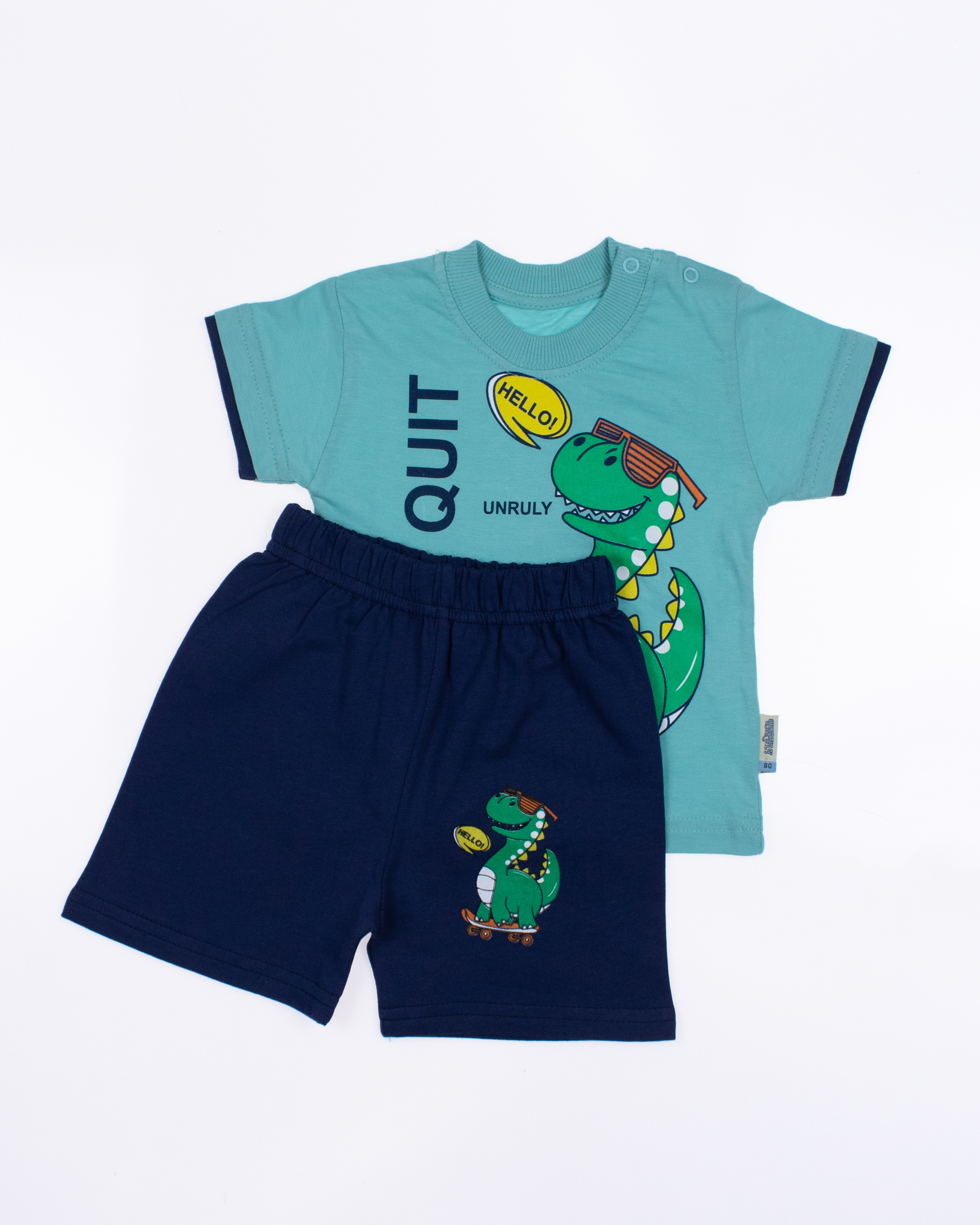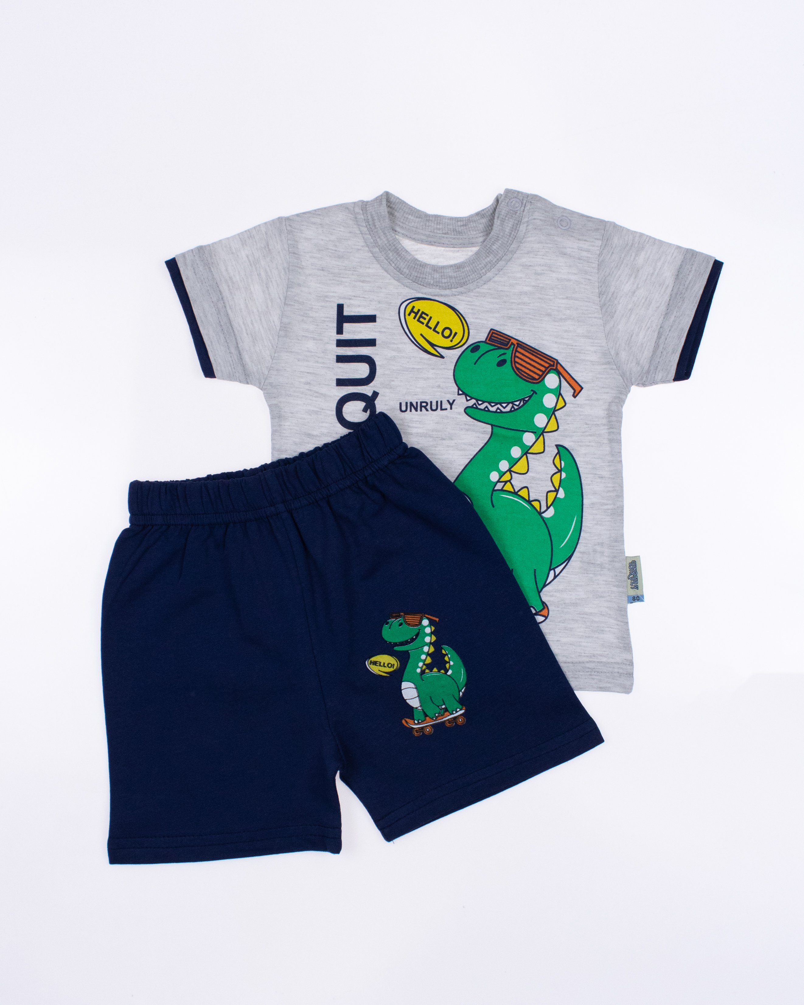 Детский костюм UNRULY выполнен из хлопкового полотна и оформлен печатным принтом. Футболка прямого кроя, с округлым вырезом горловины. Шорты умеренного объема, без  карманов.